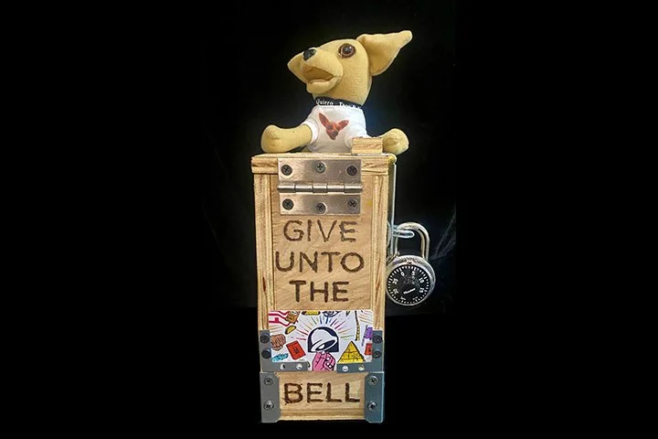 Plywood, hardware, stuffed Taco Bell dog, gift card and taco sauce